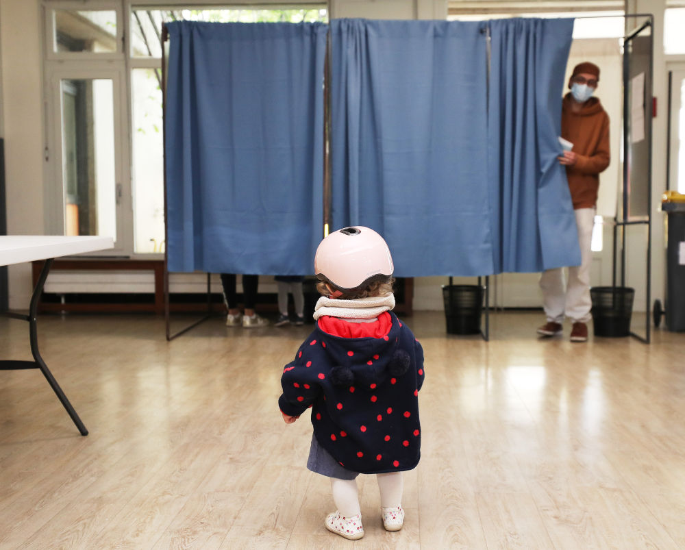 年4月24日↑2022,克里希市一家投票站正在法国巴黎相近的yaxin222.com法国总统推举第二轮投票一名女孩陪家长前来出席。