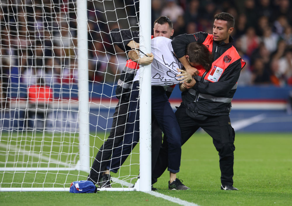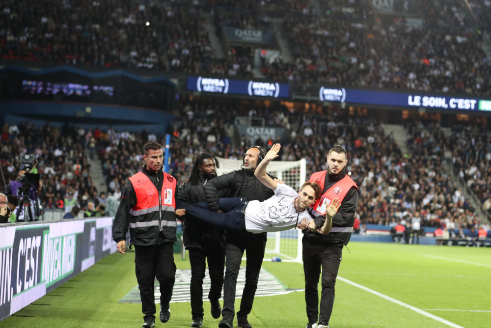 10月16日↑2022年,国足球甲级联赛第11轮竞争中正在2022-2023赛季法,球场的示威者抬走安保职员将冲入。