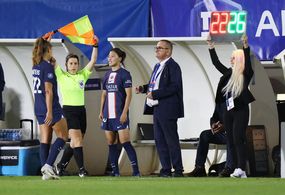 年9月9日↑2022,023赛季法国女子足球甲级联赛第一轮竞争中打定替补上场租借加盟巴黎圣日耳曼女足的李梦雯(左三)正在2022-2。