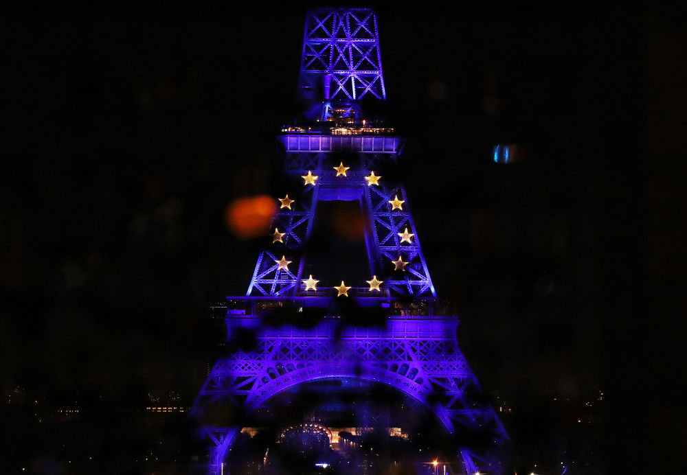 被蓝色灯光点亮的埃菲尔铁塔↑2022年1月1日拍摄的。日当,亮标志欧盟旗号色彩的蓝色法国多地地标修修接踵点,任欧牛耳席国致贺法国轮。