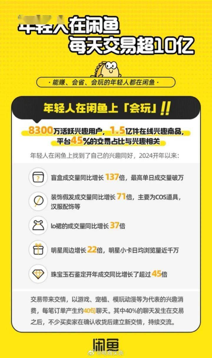 品营业总额)已冲破10亿元数据显示闲鱼日均GMV(商,一年过去,平台公布闲置超1亿人正在,用户最活动个中95后,均匀赚了2723.5元2023年95后用户。4年今后202,代接送、代做PPT等手艺效劳成交量增进迅猛理财筹议、上门妆发、羊毛毡定造、宠物演练、,上增进最疾的品类之一卡券类目则成为闲鱼,增进79%客岁同比。