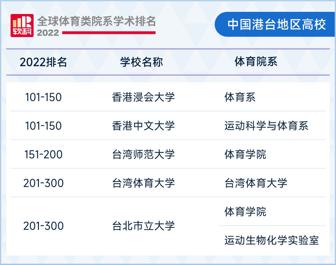 表此,有5所高校上榜我国港台地域共,科学与体育系均排活着界第101-150名香港浸会大学的体育系和香港中文大学的运动;活着界第151-200名台湾师范大学的体育学院排;育学院排活着界第201-300名台湾体育大学和台北市立大学的体。