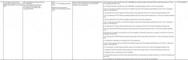 中其,伊达耶夫被禁赛8场武里南联10号谢,4号齐迪巴各被禁赛6场4号莱昂·詹姆斯和1。和姚均晟各被禁赛8场浙江队球员莱昂纳多,赛6场董宇禁,王剑禁赛6场工夫判辨师。